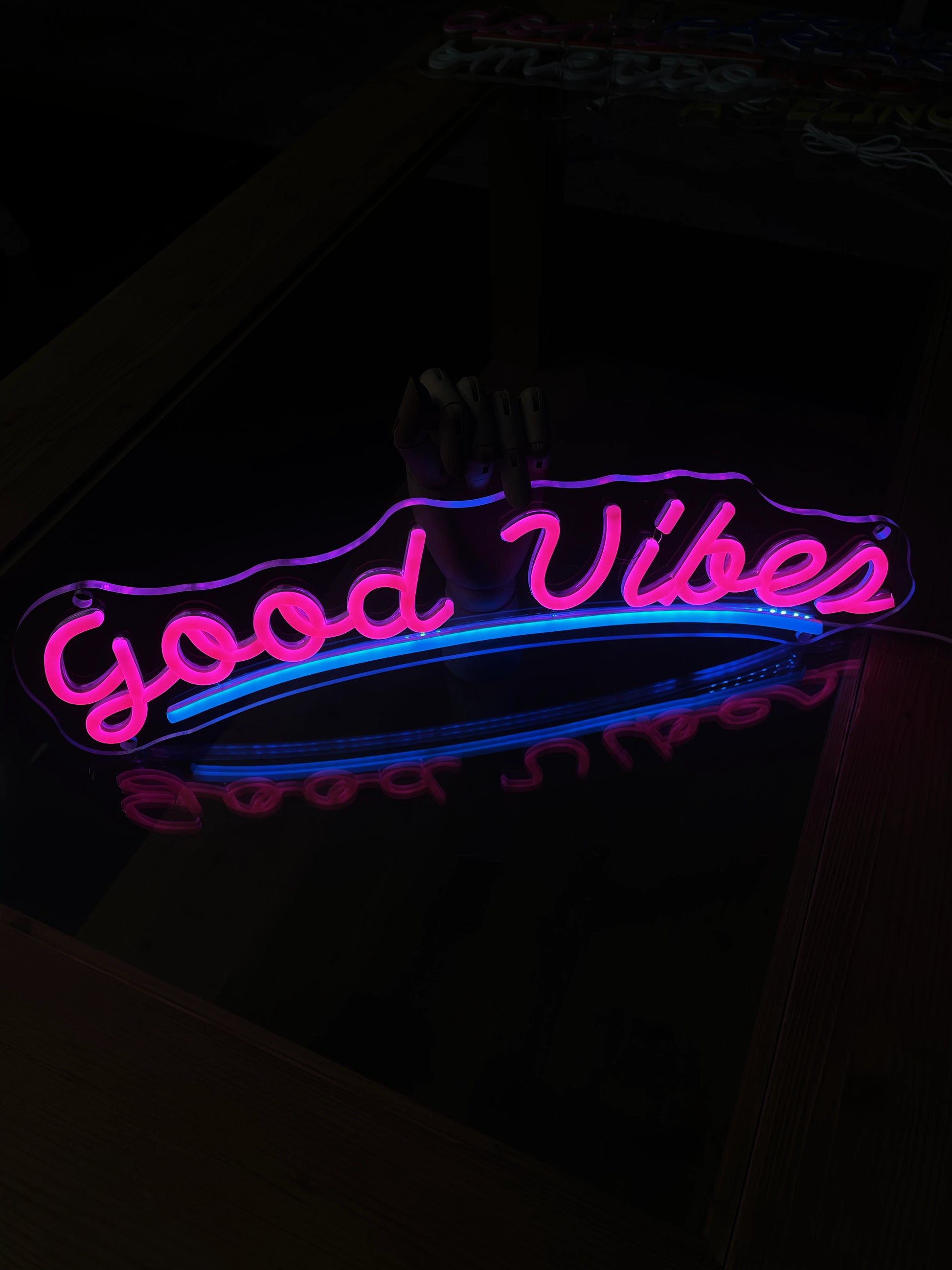 L'insegna ha una base in plexiglass trasparente su cui sono applicate delle strisce led a bassa intensità. La copertura in silicone colorato ricrea il caratteristico effetto neon.