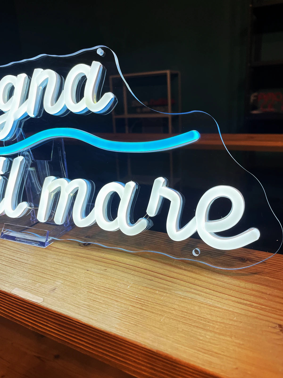 L'insegna ha una base in plexiglass trasparente su cui sono applicate delle strisce led a bassa intensità. La copertura in silicone colorato ricrea il caratteristico effetto neon.